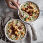 This creamy chicken noodle soup features tender chicken breast, crispy bacon, and mini homemade croutons in a rich, flavorful broth with angel hair pasta and fresh vegetables. With a balance of textures and comforting flavors, it’s a perfect hearty meal ready in just 40 minutes.